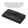 From morning workouts to nights out and everywhere in between, the Black Crocodile Luxe Faux Leather Wallet is always within reach! With two interior pockets, it can fit up to four cards, ID and cash inside and has a magnetic snap closure to prevent cards and cash from accidentally falling out. When you’re on the go, the wallet’s built-in magnets easily snap onto any MagSafe-compatible phone or case. A debossed gold logo and premium textured faux leather material give it an effortlessly elevated look for everyday wear. Snap on and snap off of your phone for accessorizing, wireless charging or for use as a stand-alone wallet.